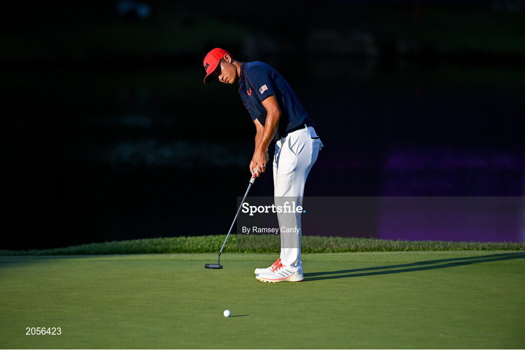 1 August 2021; Collin Morikawa of USA lines up a putt on the 18th during the bronze medal play-off in round 4 of the men's individual stroke play at the Kasumigaseki Country Club during the 2020 Tokyo Summer Olympic Games in Kawagoe, Saitama, Japan. Photo by Ramsey Cardy/Sportsfile