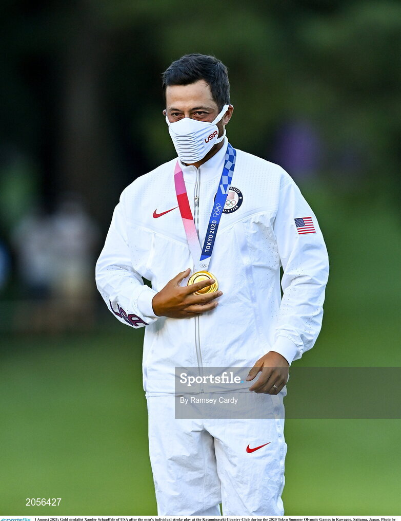 1 August 2021; Gold medalist Xander Schauffele of USA after the men's individual stroke play at the Kasumigaseki Country Club during the 2020 Tokyo Summer Olympic Games in Kawagoe, Saitama, Japan. Photo by Ramsey Cardy/Sportsfile