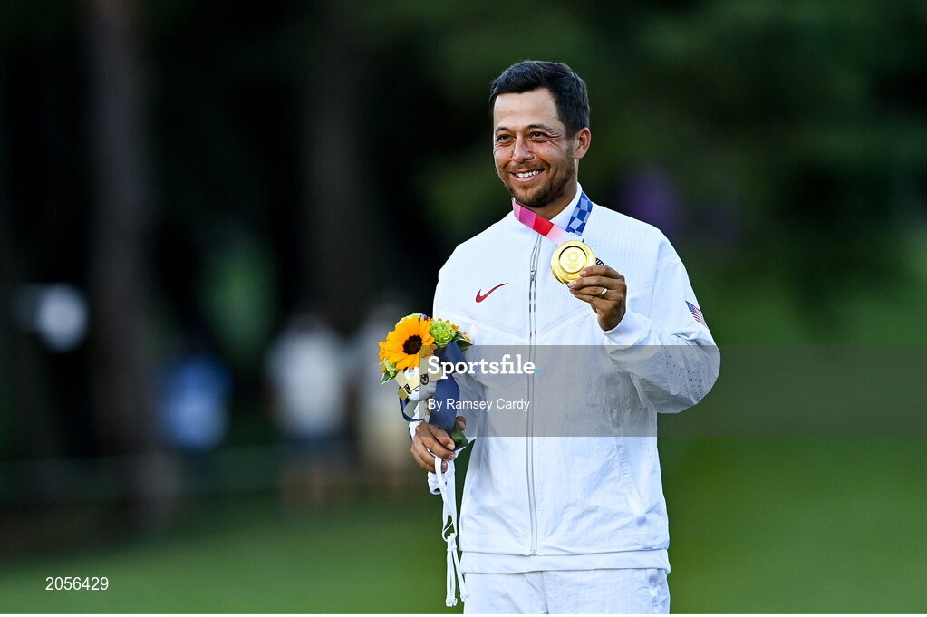 1 August 2021; Xander Schauffele of USA with his gold medal after the men's individual stroke play at the Kasumigaseki Country Club during the 2020 Tokyo Summer Olympic Games in Kawagoe, Saitama, Japan. Photo by Ramsey Cardy/Sportsfile