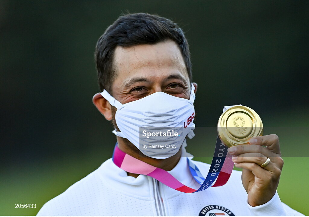 1 August 2021; Xander Schauffele of USA with his gold medal after the men's individual stroke play at the Kasumigaseki Country Club during the 2020 Tokyo Summer Olympic Games in Kawagoe, Saitama, Japan. Photo by Ramsey Cardy/Sportsfile
