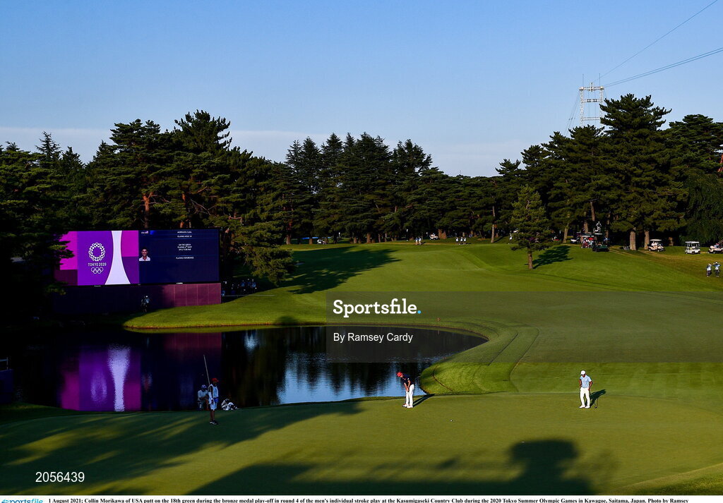 1 August 2021; Collin Morikawa of USA putt on the 18th green during the bronze medal play-off in round 4 of the men's individual stroke play at the Kasumigaseki Country Club during the 2020 Tokyo Summer Olympic Games in Kawagoe, Saitama, Japan. Photo by Ramsey Cardy/Sportsfile