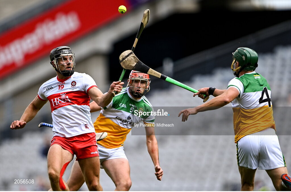 1 August 2021; Deaghlan Foley of Derry in action against Aidan Treacy, centre, and David King of Offaly during the Christy Ring Cup Final match between Derry and Offaly at Croke Park in Dublin. Photo by Piaras Ó Mídheach/Sportsfile