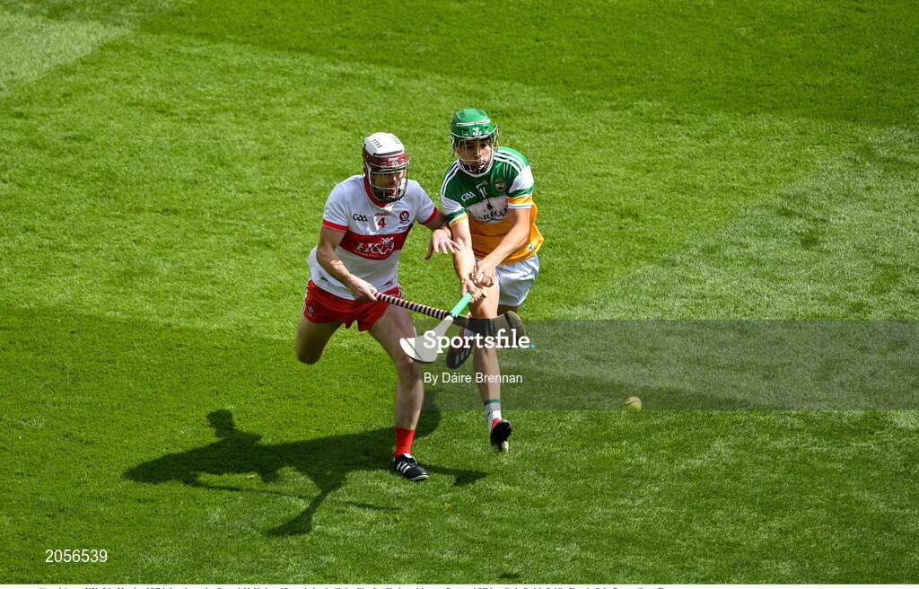 1 August 2021; John Murphy of Offaly in action against Darragh McCloskey of Derry during the Christy Ring Cup Final match between Derry and Offaly at Croke Park in Dublin. Photo by Daire Brennan/Sportsfile