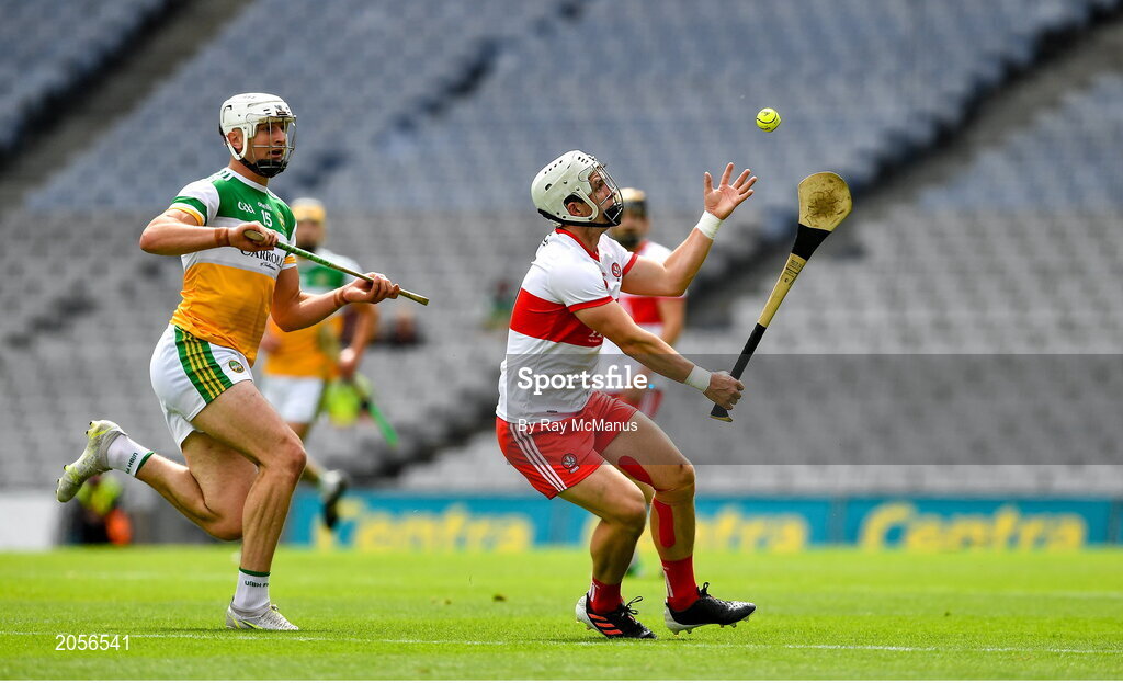1 August 2021; Cormac O'Doherty of Derry in action against Oisín Kelly of Offaly during the Leinster GAA Football Senior Championship Final match between Dublin and Kildare at Croke Park in Dublin. Photo by Ray McManus/Sportsfile