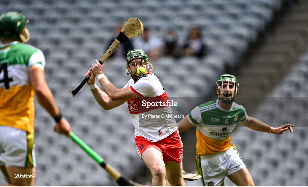 1 August 2021; Gerald Bradley of Derry shoots to score his side's first goal, under pressure from Ben Conneely of Offaly, during the Christy Ring Cup Final match between Derry and Offaly at Croke Park in Dublin. Photo by Piaras Ó Mídheach/Sportsfile