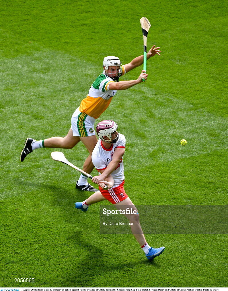 1 August 2021; Brian Cassidy of Derry in action against Paddy Delaney of Offaly during the Christy Ring Cup Final match between Derry and Offaly at Croke Park in Dublin. Photo by Daire Brennan/Sportsfile