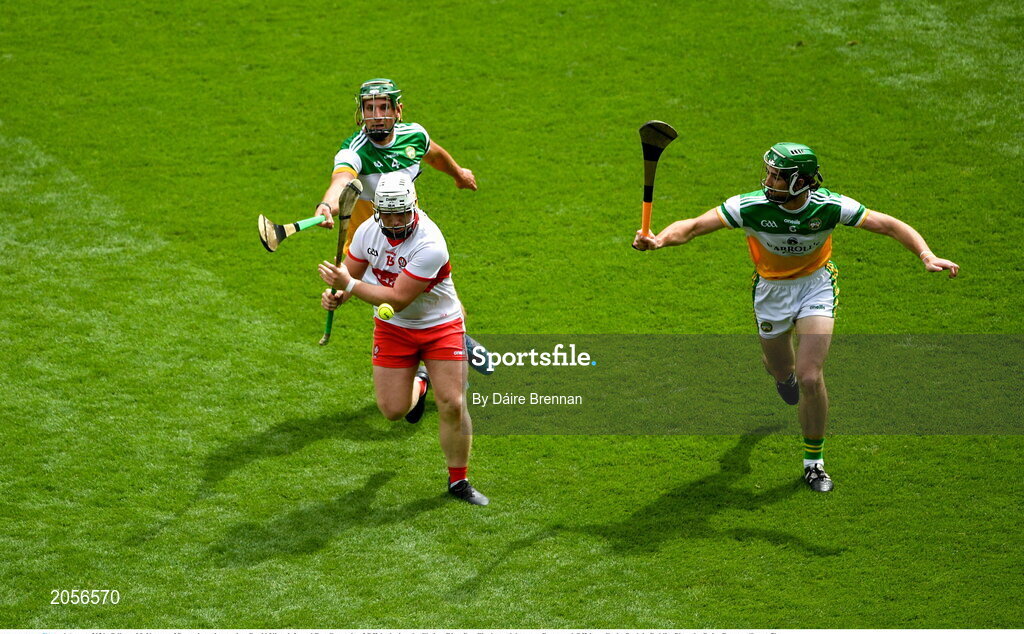 1 August 2021; Odhran McKeever of Derry in action against David King, left, and Ben Conneely of Offaly during the Christy Ring Cup Final match between Derry and Offaly at Croke Park in Dublin. Photo by Daire Brennan/Sportsfile