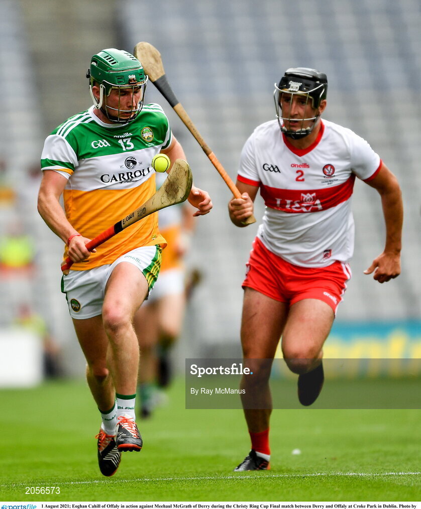 1 August 2021; Eoghan Cahill of Offaly in action against Meehaul McGrath of Derry during the Christy Ring Cup Final match between Derry and Offaly at Croke Park in Dublin. Photo by Ray McManus/Sportsfile