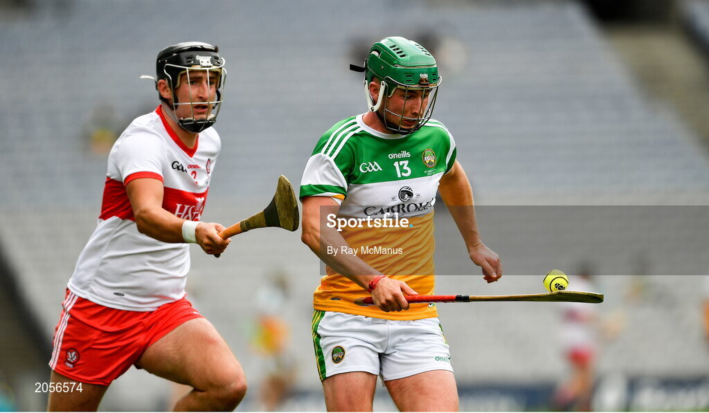1 August 2021; Eoghan Cahill of Offaly in action against Meehaul McGrath of Derry during the Christy Ring Cup Final match between Derry and Offaly at Croke Park in Dublin. Photo by Ray McManus/Sportsfile