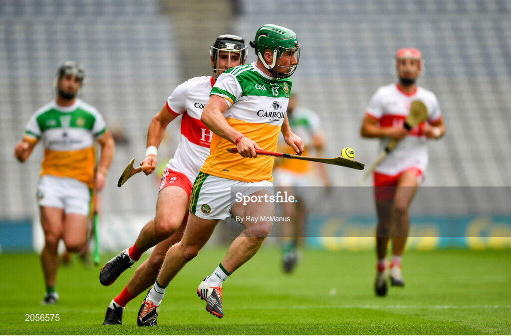 1 August 2021; Eoghan Cahill of Offaly in action against Meehaul McGrath of Derry during the Christy Ring Cup Final match between Derry and Offaly at Croke Park in Dublin. Photo by Ray McManus/Sportsfile