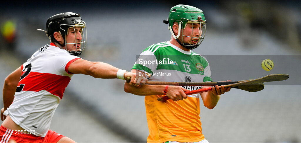 1 August 2021; Eoghan Cahill of Offaly is tackled by Meehaul McGrath of Derry during the Christy Ring Cup Final match between Derry and Offaly at Croke Park in Dublin. Photo by Ray McManus/Sportsfile