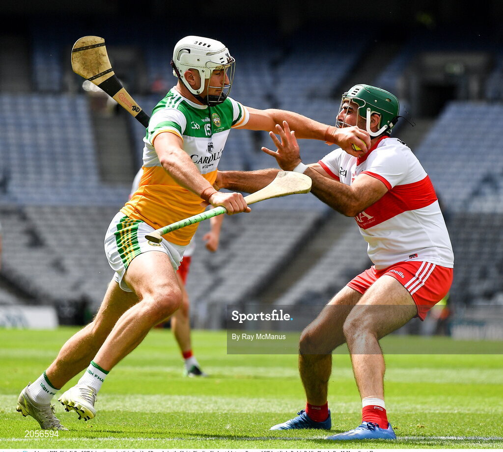 1 August 2021; Oisín Kelly of Offaly in action against Seán Cassidy of Derry during the Christy Ring Cup Final match between Derry and Offaly at Croke Park in Dublin. Photo by Ray McManus/Sportsfile