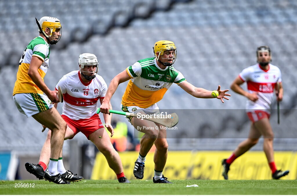 1 August 2021; Killian Sampson of Offaly gathers possession ahead of Odhran McKeever of Derry during the Christy Ring Cup Final match between Derry and Offaly at Croke Park in Dublin. Photo by Piaras Ó Mídheach/Sportsfile