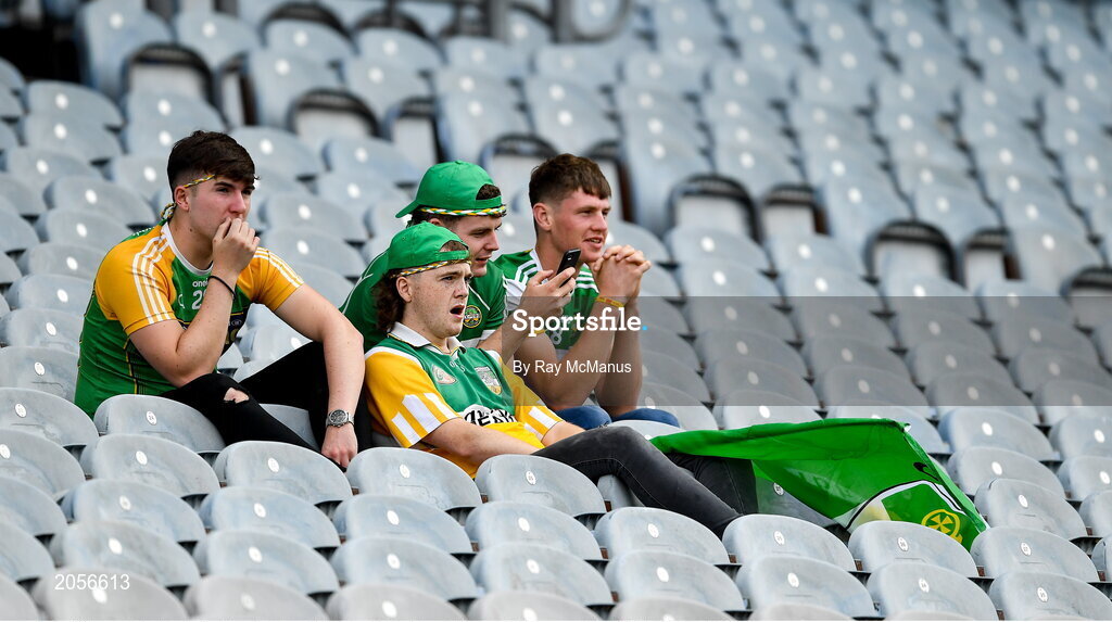 1 August 2021; Offaly supporters, left to right, Seán Hassett, Ronan McNamara, Gearóid McCormack and Cian Burke relax in the Cusack stand as they watch the Christy Ring Cup Final match between Derry and Offaly at Croke Park in Dublin. Photo by Ray McManus/Sportsfile
