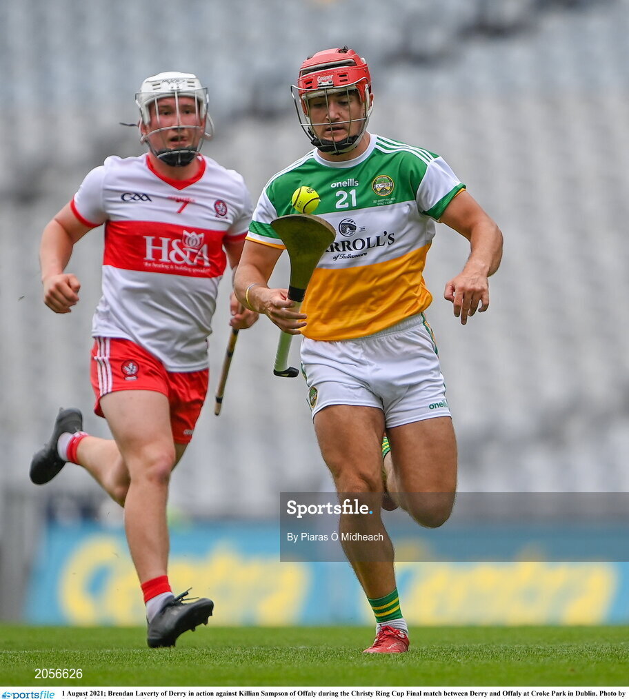 1 August 2021; Brendan Laverty of Derry in action against Killian Sampson of Offaly during the Christy Ring Cup Final match between Derry and Offaly at Croke Park in Dublin. Photo by Piaras Ó Mídheach/Sportsfile