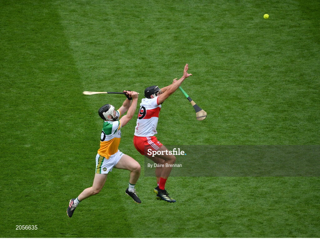 1 August 2021; Deaghlan Foley of Derry in action against Eimhín Kelly of Offaly during the Christy Ring Cup Final match between Derry and Offaly at Croke Park in Dublin. Photo by Daire Brennan/Sportsfile