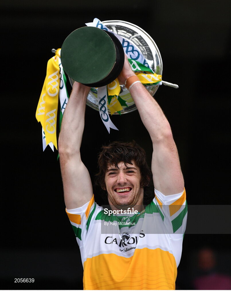 1 August 2021; Offaly captain Ben Conneely lifts the Christy Ring Cup at the presentation after the Christy Ring Cup Final match between Derry and Offaly at Croke Park in Dublin. Photo by Ray McManus/Sportsfile