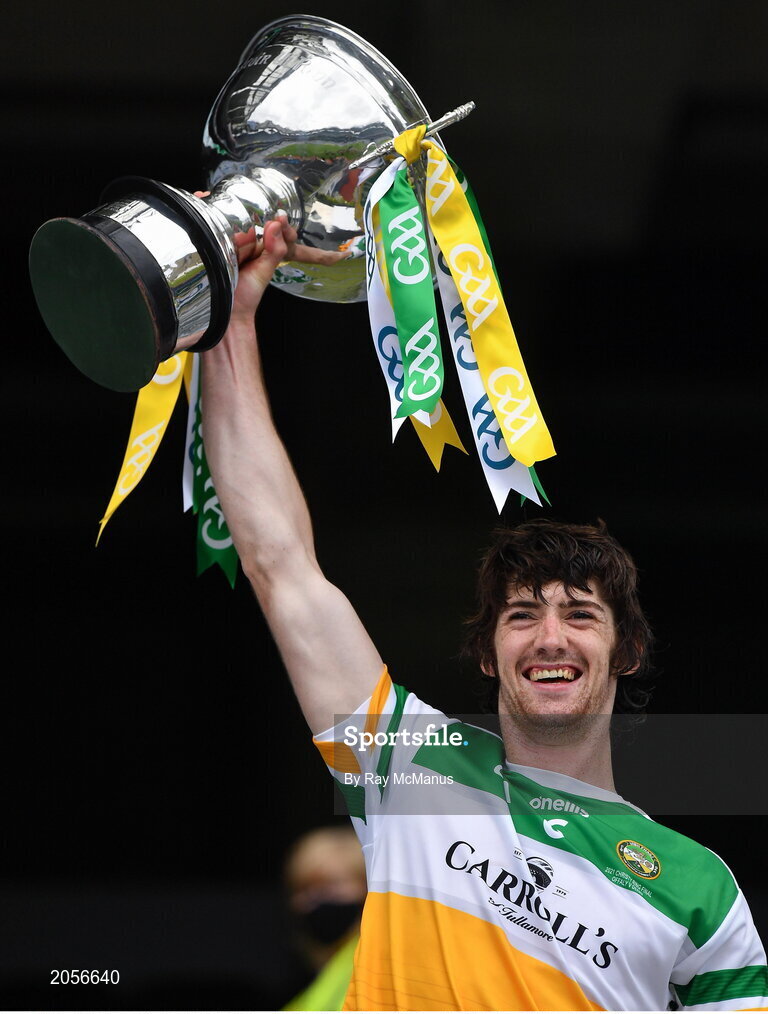 1 August 2021; Offaly captain Ben Conneely lifts the Christy Ring Cup at the presentation after the Christy Ring Cup Final match between Derry and Offaly at Croke Park in Dublin. Photo by Ray McManus/Sportsfile
