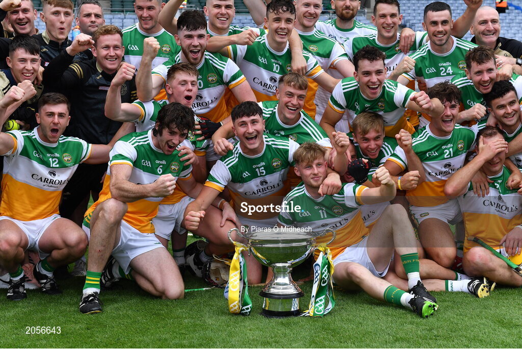 1 August 2021; Offaly players celebrate after the Christy Ring Cup Final match between Derry and Offaly at Croke Park in Dublin. Photo by Piaras Ó Mídheach/Sportsfile