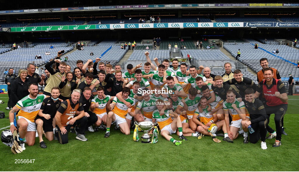1 August 2021; The Offaly players, officials and manager Michael Fennelly celebrate after the Christy Ring Cup Final match between Derry and Offaly at Croke Park in Dublin. Photo by Ray McManus/Sportsfile