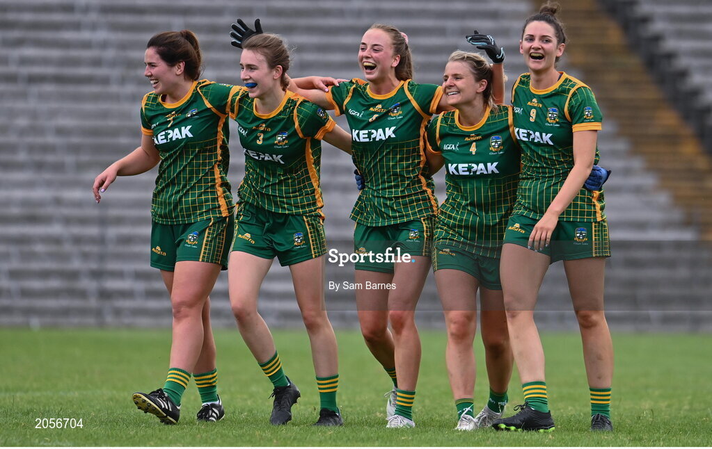 1 August 2021; Meath players, from left, Shauna Ennis, Mary Kate Lynch, Aoibhín Cleary, Katie Newe and Máire O'Shaughnessy, celebrate after their side's victory in the TG4 Ladies Football All-Ireland Championship Quarter-Final match between Armagh and Meath at St Tiernach's Park in Clones, Monaghan. Photo by Sam Barnes/Sportsfile