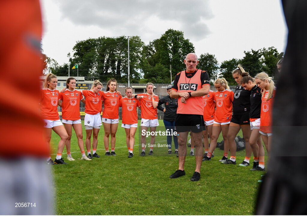 1 August 2021; Armagh manager Ronan Murphy gives a team talk after the TG4 Ladies Football All-Ireland Championship Quarter-Final match between Armagh and Meath at St Tiernach's Park in Clones, Monaghan. Photo by Sam Barnes/Sportsfile