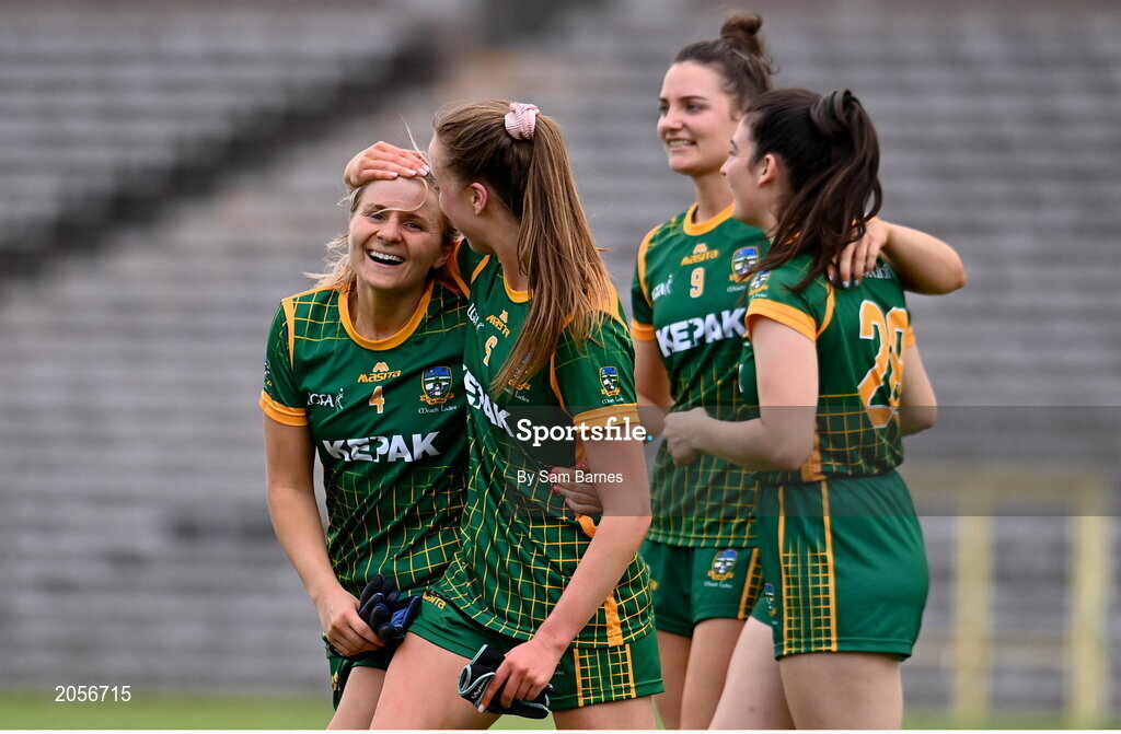 1 August 2021; Meath players, from left, Katie Newe, Aoibhín Cleary, Máire O'Shaughnessy, and Shelly Melia celebrate after the TG4 Ladies Football All-Ireland Championship Quarter-Final match between Armagh and Meath at St Tiernach's Park in Clones, Monaghan. Photo by Sam Barnes/Sportsfile