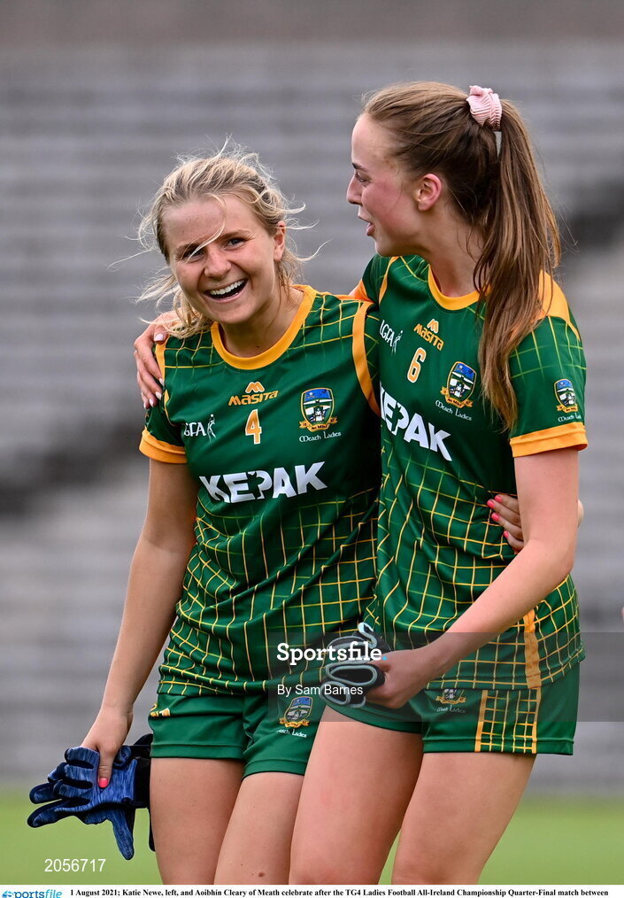 1 August 2021; Katie Newe, left, and Aoibhín Cleary of Meath celebrate after the TG4 Ladies Football All-Ireland Championship Quarter-Final match between Armagh and Meath at St Tiernach's Park in Clones, Monaghan. Photo by Sam Barnes/Sportsfile