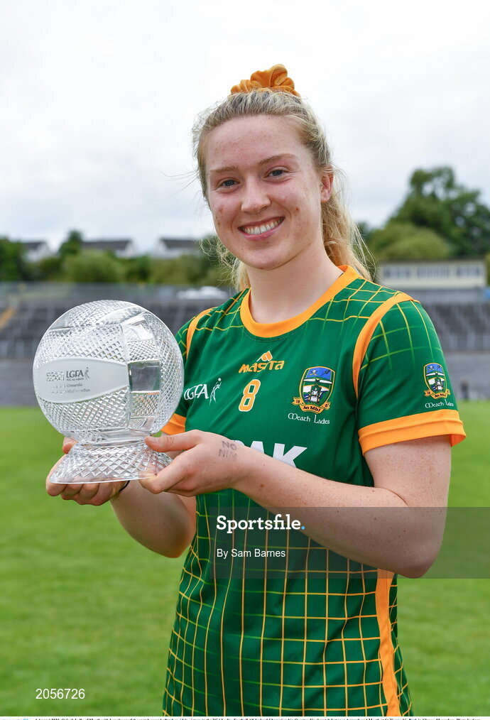 1 August 2021; Orlagh Lally of Meath with her player of the match award after her side's victory in the TG4 Ladies Football All-Ireland Championship Quarter-Final match between Armagh and Meath at St Tiernach's Park in Clones, Monaghan. Photo by Sam Barnes/Sportsfile
