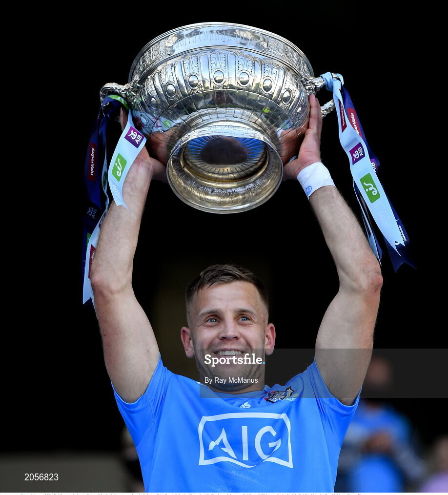 1 August 2021; Dublin captain Jonny Cooper lifts the Delaney cup after the Leinster GAA Football Senior Championship Final match between Dublin and Kildare at Croke Park in Dublin. Photo by Ray McManus/Sportsfile