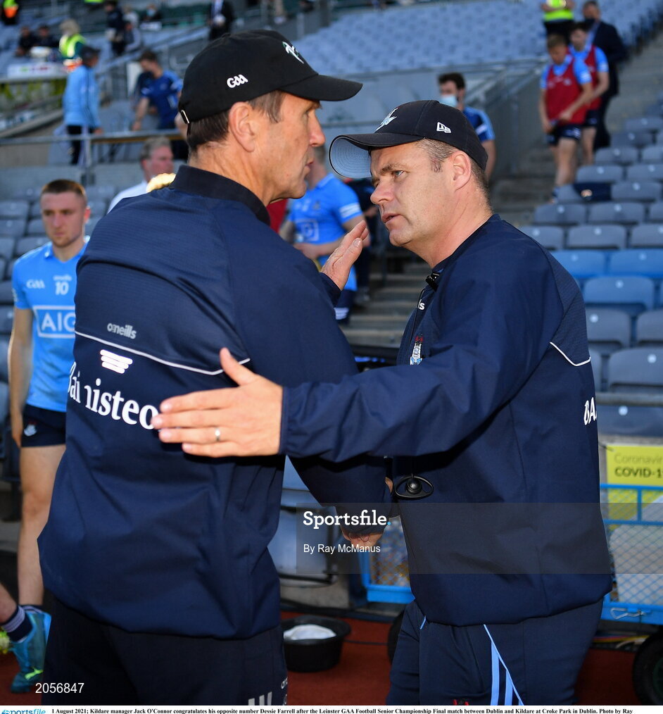 1 August 2021; Kildare manager Jack O'Connor congratulates his opposite number Dessie Farrell after the Leinster GAA Football Senior Championship Final match between Dublin and Kildare at Croke Park in Dublin. Photo by Ray McManus/Sportsfile