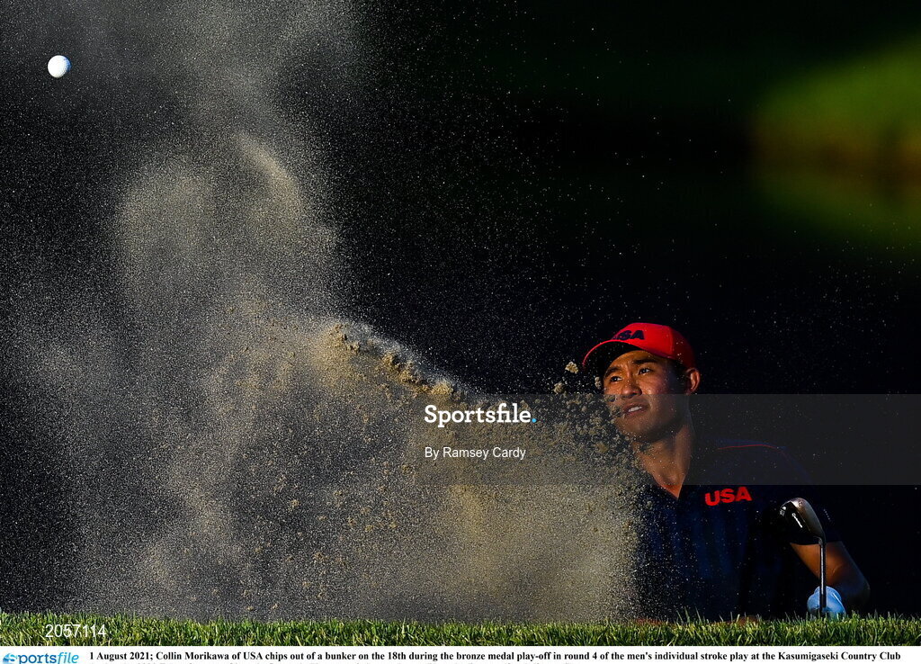 1 August 2021; Collin Morikawa of USA chips out of a bunker on the 18th during the bronze medal play-off in round 4 of the men's individual stroke play at the Kasumigaseki Country Club during the 2020 Tokyo Summer Olympic Games in Kawagoe, Saitama, Japan. Photo by Ramsey Cardy/Sportsfile