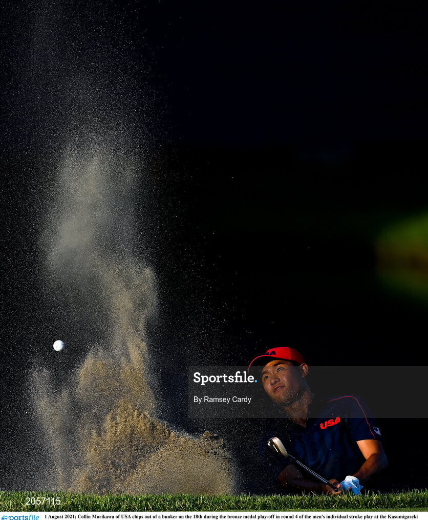 1 August 2021; Collin Morikawa of USA chips out of a bunker on the 18th during the bronze medal play-off in round 4 of the men's individual stroke play at the Kasumigaseki Country Club during the 2020 Tokyo Summer Olympic Games in Kawagoe, Saitama, Japan. Photo by Ramsey Cardy/Sportsfile