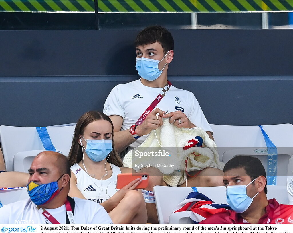 2 August 2021; Tom Daley of Great Britain knits during the preliminary round of the men's 3m springboard at the Tokyo Aquatics Centre on day ten of the 2020 Tokyo Summer Olympic Games in Tokyo, Japan. Photo by Stephen McCarthy/Sportsfile