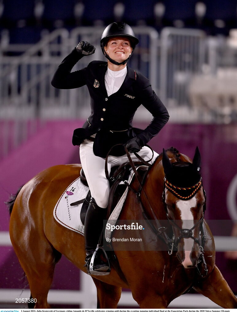 2 August 2021; Julia Krajewski of Germany riding Amande de B'Neville celebrates winning gold during the eventing jumping individual final at the Equestrian Park during the 2020 Tokyo Summer Olympic Games in Tokyo, Japan. Photo by Brendan Moran/Sportsfile