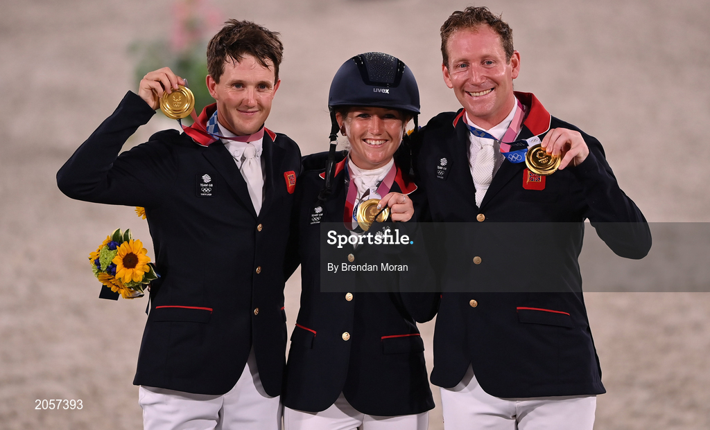 2 August 2021; Team Great Britain members, from left, Tom McEwen, Laura Collett and Oliver Townend celebrate with their gold medals after winning the eventing jumping individual final at the Equestrian Park during the 2020 Tokyo Summer Olympic Games in Tokyo, Japan. Photo by Brendan Moran/Sportsfile