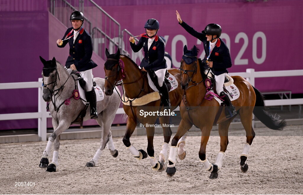 2 August 2021; Team Great Britain members, from left, Oliver Townend, Laura Collett and Tom McEwen celebrate with their gold medals after winning the eventing jumping individual final at the Equestrian Park during the 2020 Tokyo Summer Olympic Games in Tokyo, Japan. Photo by Brendan Moran/Sportsfile