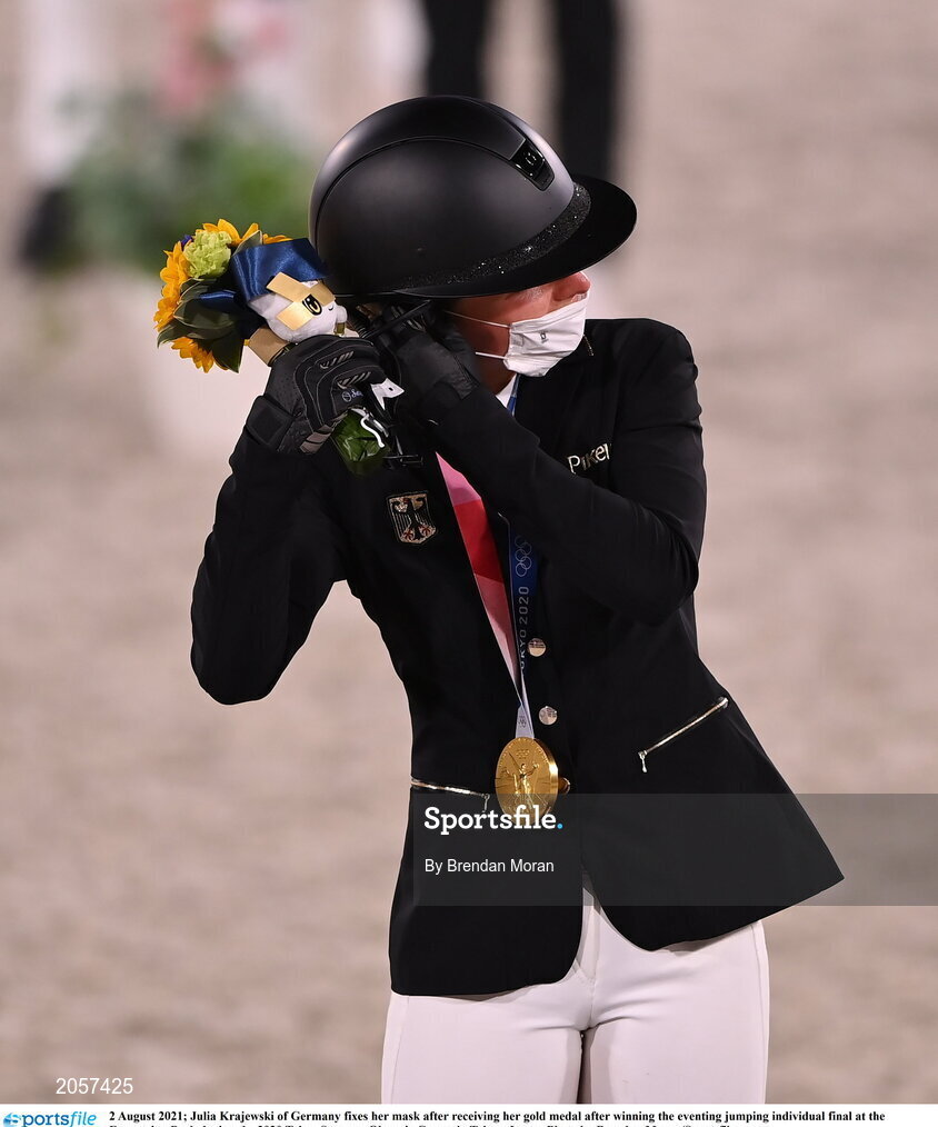2 August 2021; Julia Krajewski of Germany fixes her mask after receiving her gold medal after winning the eventing jumping individual final at the Equestrian Park during the 2020 Tokyo Summer Olympic Games in Tokyo, Japan. Photo by Brendan Moran/Sportsfile