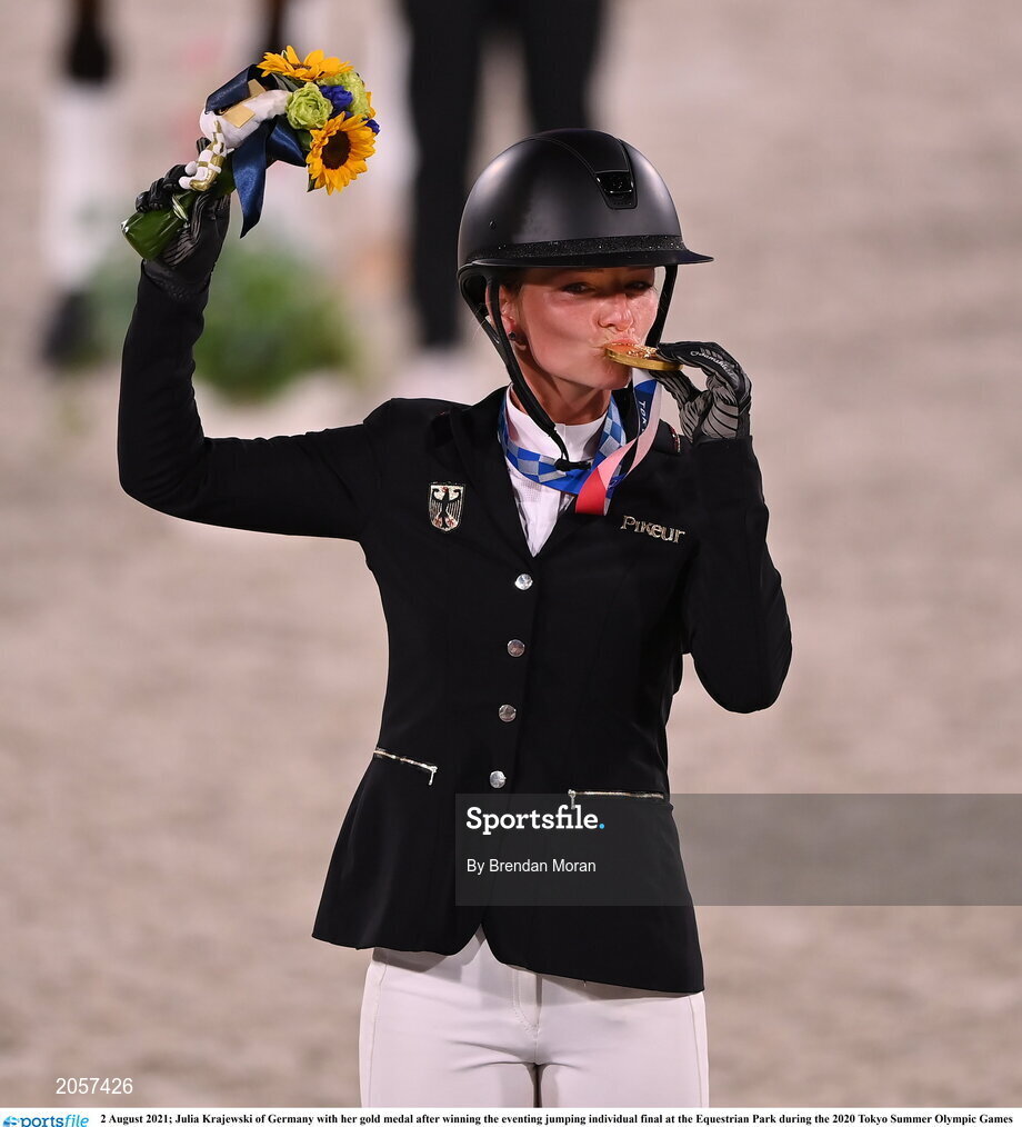 2 August 2021; Julia Krajewski of Germany with her gold medal after winning the eventing jumping individual final at the Equestrian Park during the 2020 Tokyo Summer Olympic Games in Tokyo, Japan. Photo by Brendan Moran/Sportsfile