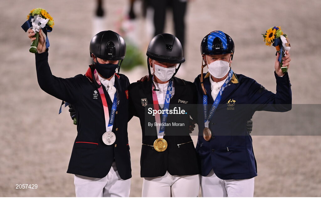 2 August 2021; Gold medallist Julia Krajewski of Germany, centre, with silver medallist Tom McEwen of Great Britain, left, and bronze medallist Andrew Hoy of Australia after the eventing jumping individual final at the Equestrian Park during the 2020 Tokyo Summer Olympic Games in Tokyo, Japan. Photo by Brendan Moran/Sportsfile