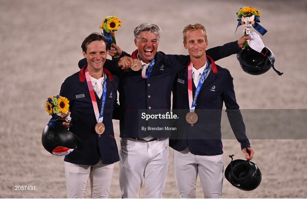 2 August 2021; Team France members, from left, Nicolas Touzaint, Karim Florent Laghouag and Cristopher Six celebrate with their bronze medals after winning the eventing jumping individual final at the Equestrian Park during the 2020 Tokyo Summer Olympic Games in Tokyo, Japan. Photo by Brendan Moran/Sportsfile