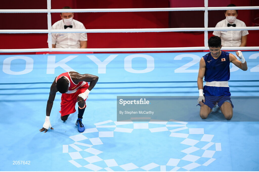 3 August 2021; Ryomei Tanaka of Japan, right, after being declared victorious over Yuberjen Herney Martinez Rivas of Colombia during their men's flyweight quarter-final bout at the Kokugikan Arena during the 2020 Tokyo Summer Olympic Games in Tokyo, Japan. Photo by Stephen McCarthy/Sportsfile