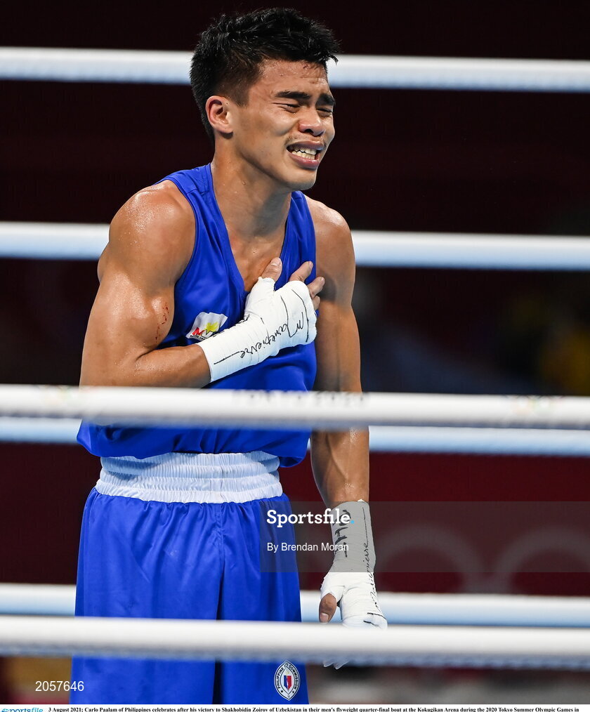 3 August 2021; Carlo Paalam of Philippines celebrates after his victory to Shakhobidin Zoirov of Uzbekistan in their men's flyweight quarter-final bout at the Kokugikan Arena during the 2020 Tokyo Summer Olympic Games in Tokyo, Japan. Photo by Brendan Moran/Sportsfile