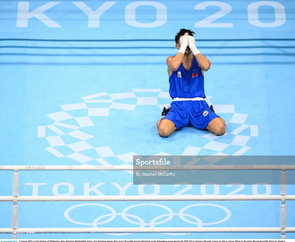 3 August 2021; Carlo Paalam of Philippines after defeating Shakhobidin Zoirov of Uzbekistan during their men's flyweight quarter-final bout at the Kokugikan Arena during the 2020 Tokyo Summer Olympic Games in Tokyo, Japan. Photo by Stephen McCarthy/Sportsfile