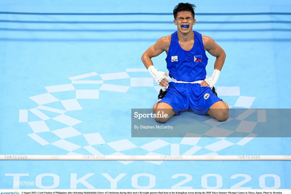 3 August 2021; Carlo Paalam of Philippines after defeating Shakhobidin Zoirov of Uzbekistan during their men's flyweight quarter-final bout at the Kokugikan Arena during the 2020 Tokyo Summer Olympic Games in Tokyo, Japan. Photo by Stephen McCarthy/Sportsfile