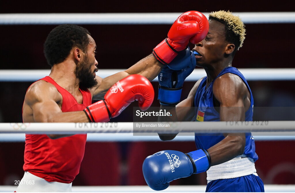 3 August 2021; Duke Ragan of USA, left, and Samuel Takyi of Ghana during their men's featherweight semi-final bout at the Kokugikan Arena during the 2020 Tokyo Summer Olympic Games in Tokyo, Japan. Photo by Brendan Moran/Sportsfile