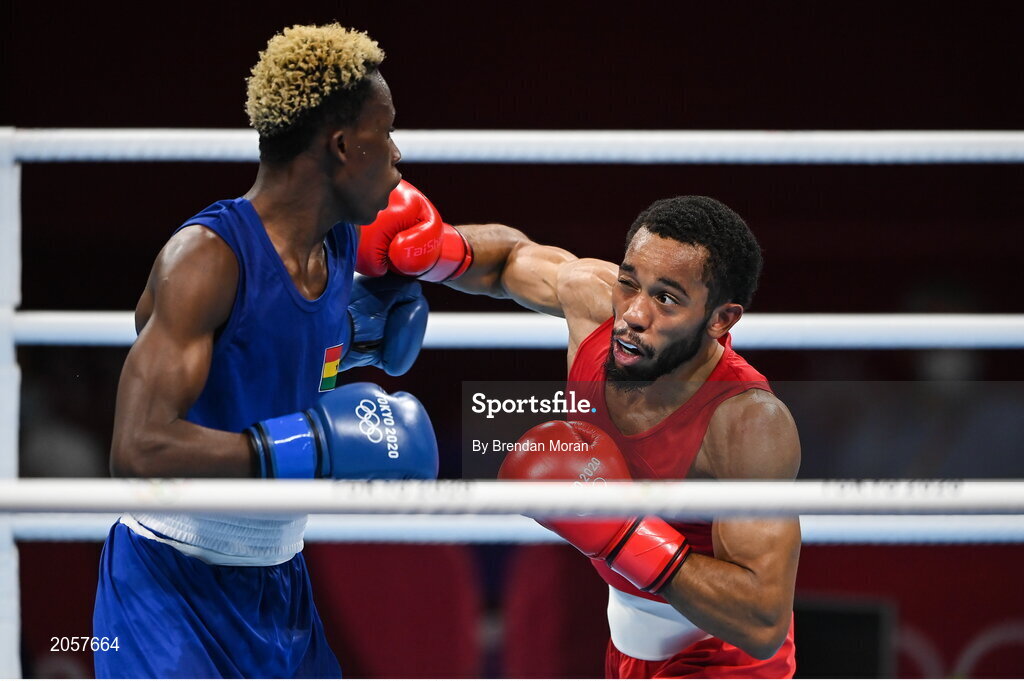 3 August 2021; Duke Ragan of USA, right, and Samuel Takyi of Ghana during their men's featherweight semi-final bout at the Kokugikan Arena during the 2020 Tokyo Summer Olympic Games in Tokyo, Japan. Photo by Brendan Moran/Sportsfile