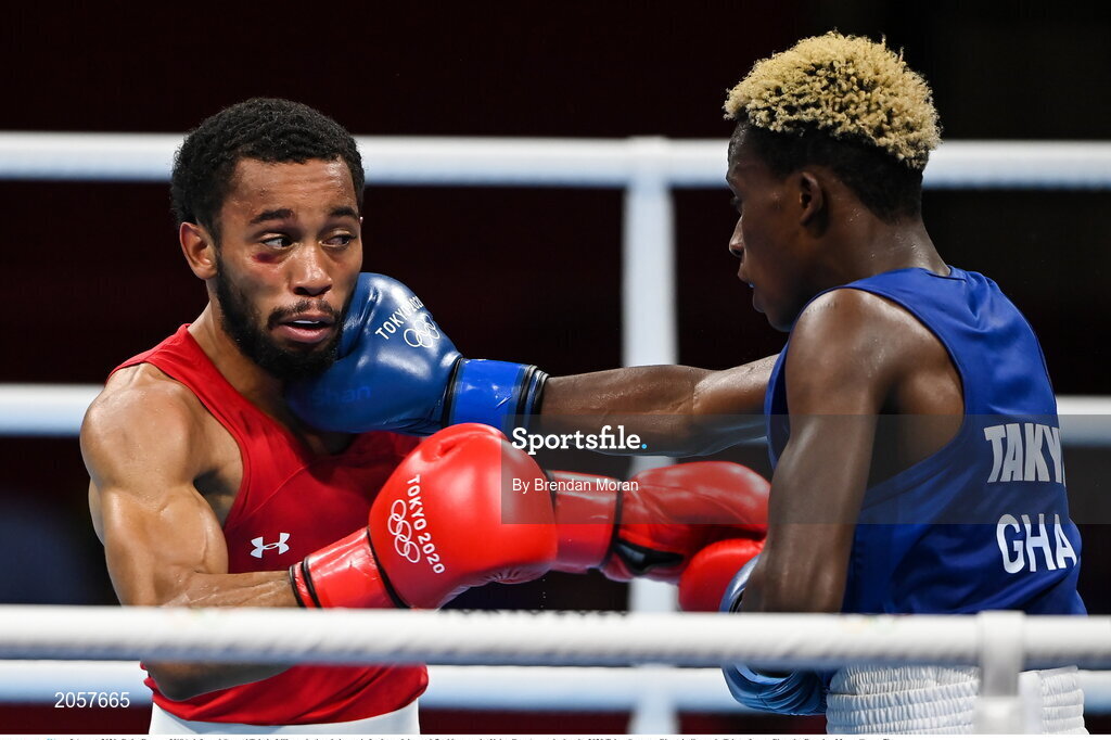 3 August 2021; Duke Ragan of USA, left, and Samuel Takyi of Ghana during their men's featherweight semi-final bout at the Kokugikan Arena during the 2020 Tokyo Summer Olympic Games in Tokyo, Japan. Photo by Brendan Moran/Sportsfile