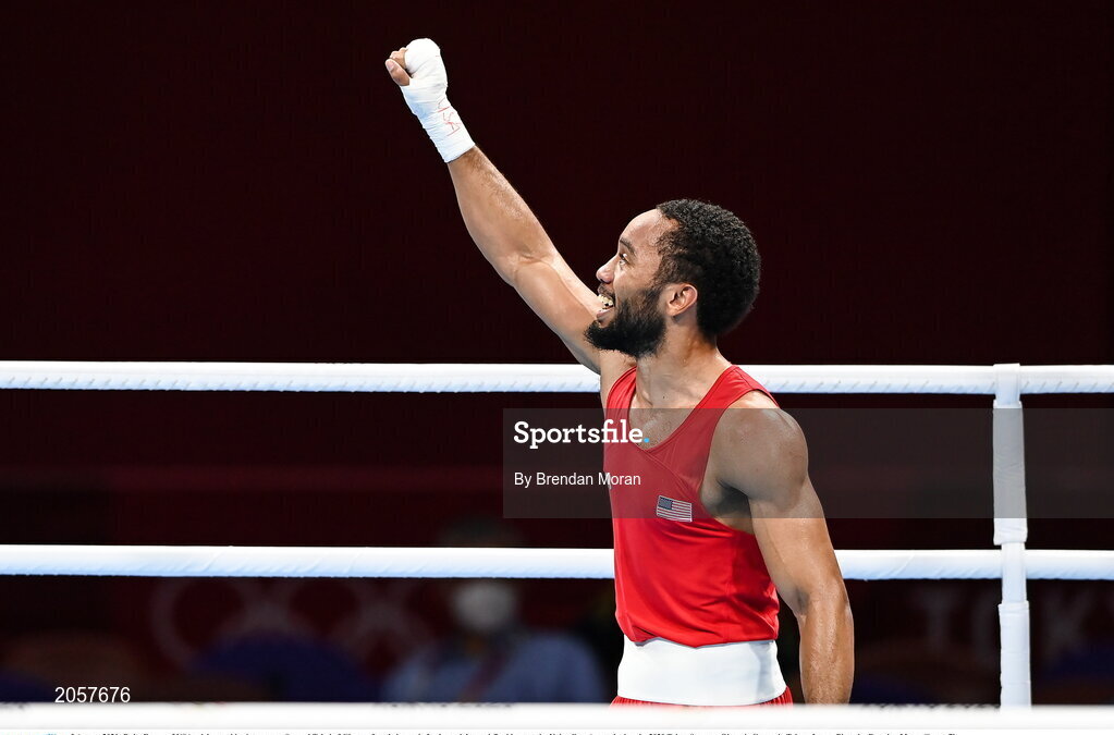3 August 2021; Duke Ragan of USA celebrates his victory over Samuel Takyi of Ghana after their men's featherweight semi-final bout at the Kokugikan Arena during the 2020 Tokyo Summer Olympic Games in Tokyo, Japan. Photo by Brendan Moran/Sportsfile