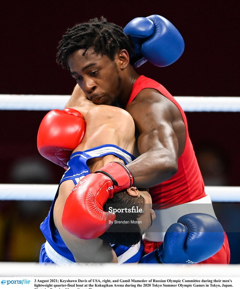 3 August 2021; Keyshawn Davis of USA, right, and Gamil Mamedov of Russian Olympic Committee during their men's lightweight quarter-final bout at the Kokugikan Arena during the 2020 Tokyo Summer Olympic Games in Tokyo, Japan. Photo by Brendan Moran/Sportsfile